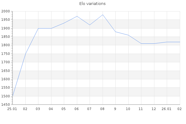 Elo no rounded:1818.1 Rd ( Small rd indicates a reliable elo ) : 83 Elo max :1980 Elo max this year :1980 Moves played :1160 Country:Australia