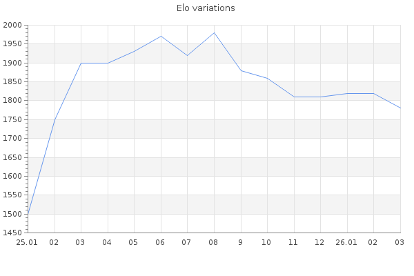 Elo no rounded:1781.2 Rd ( Small rd indicates a reliable elo ) : 83 Elo max :1980 Elo max this year :1980 Moves played :1472 Country:Australia