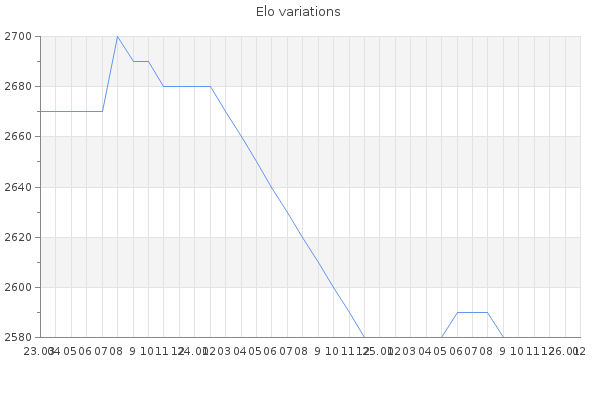 Elo no rounded:2577.1 Rd ( Small rd indicates a reliable elo ) : 123 Fast Elo :1789 Fast Rd : 256 Elo max :2860 Elo max this year :2860 Moves played :2894 Country:United States of America