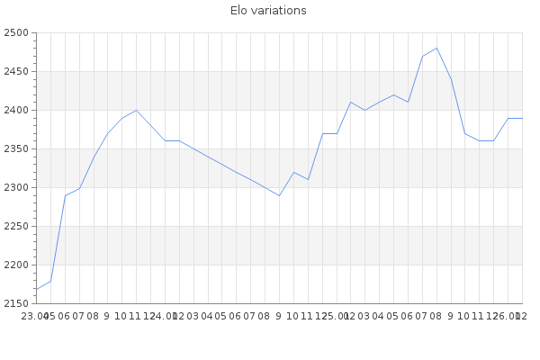 Elo no rounded:2389.4 Rd ( Small rd indicates a reliable elo ) : 93 Elo max :2490 Elo max this year :2490 Moves played :1803 Country:Cuba