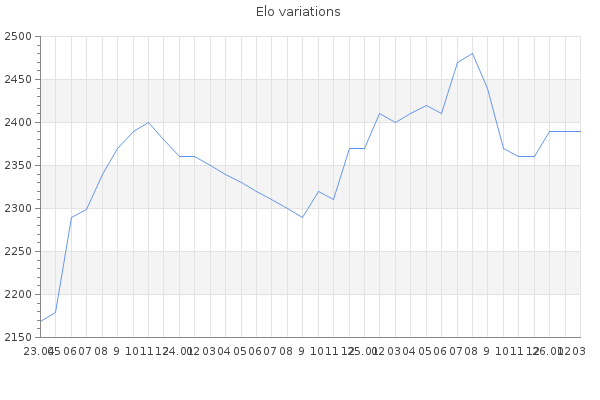 Remaining days of holidays :15 Elo no rounded:2389.4 Rd ( Small rd indicates a reliable elo ) : 93 Elo max :2490 Elo max this year :2490 Moves played :1839 Country:Cuba