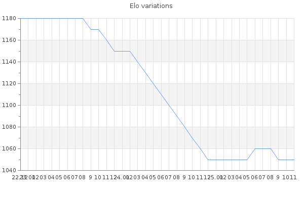 Elo no rounded:1054.6 Rd ( Small rd indicates a reliable elo ) : 80 Fast Elo :1539 Fast Rd : 296 Elo max :1640 Elo max this year :1640 Moves played :345 Country:Turkey