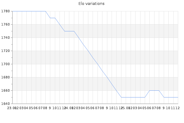 Elo no rounded:1654.5 Rd ( Small rd indicates a reliable elo ) : 141 Fast Elo :2080 Fast Rd : 128 Elo max :2490 Elo max this year :2490 Moves played :849 Country:Germany