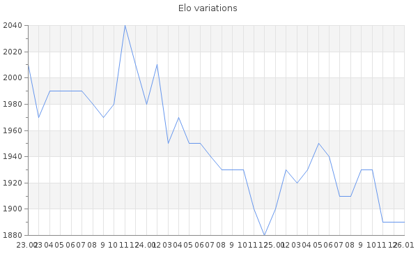 Elo no rounded:1889 Rd ( Small rd indicates a reliable elo ) : 94 Elo max :2300 Elo max this year :2300 Moves played :34661 Country:Czech Republic