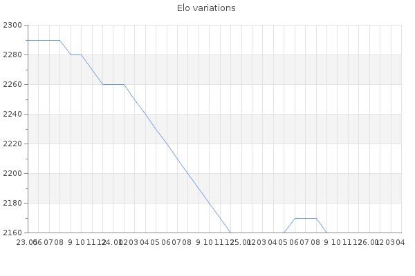 Elo no rounded:2156.6 Rd ( Small rd indicates a reliable elo ) : 113 Elo max :2570 Elo max this year :2570 Moves played :2859 Country:Italy