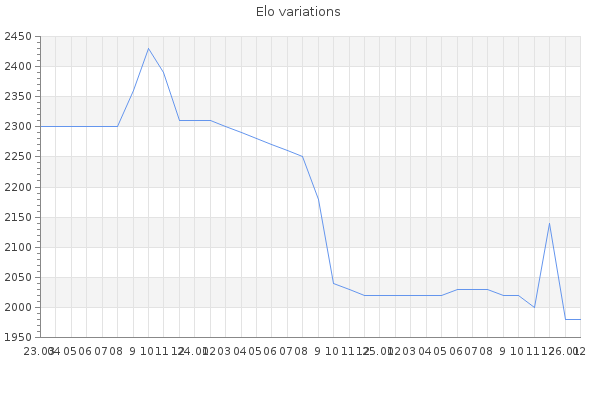 Elo no rounded:1978.4 Rd ( Small rd indicates a reliable elo ) : 86 Fast Elo :1569 Fast Rd : 273 Elo max :2530 Elo max this year :2530 Moves played :9491 Country:Germany