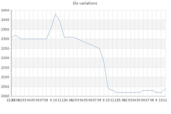 Elo no rounded:2043.2 Rd ( Small rd indicates a reliable elo ) : 145 Fast Elo :1569 Fast Rd : 273 Elo max :2530 Elo max this year :2530 Moves played :9173 Country:Germany