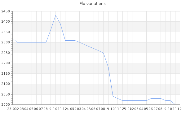 Elo no rounded:1999.4 Rd ( Small rd indicates a reliable elo ) : 125 Fast Elo :1569 Fast Rd : 273 Elo max :2530 Elo max this year :2530 Moves played :9288 Country:Germany