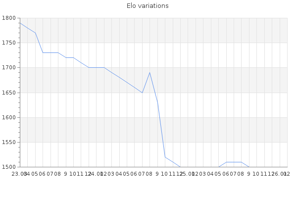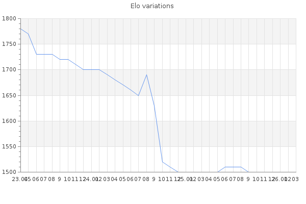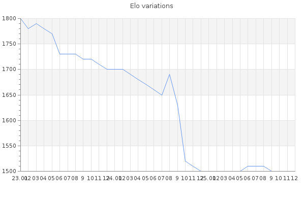 Elo no rounded:1503.8 Rd ( Small rd indicates a reliable elo ) : 119 Fast Elo :1790 Fast Rd : 95 Elo max :2240 Elo max this year :2240 Moves played :23745 Country:Italy