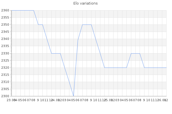 Elo no rounded:2320.4 Rd ( Small rd indicates a reliable elo ) : 127 Fast Elo :2180 Fast Rd : 131 Elo max :2540 Elo max this year :2540 Moves played :2292 Country:United States of America