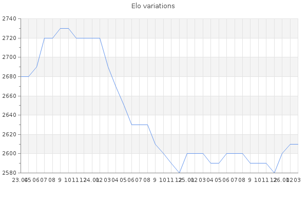 Elo no rounded:2614.6 Rd ( Small rd indicates a reliable elo ) : 105 Elo max :2770 Elo max this year :2770 Moves played :7469 Country:Spain