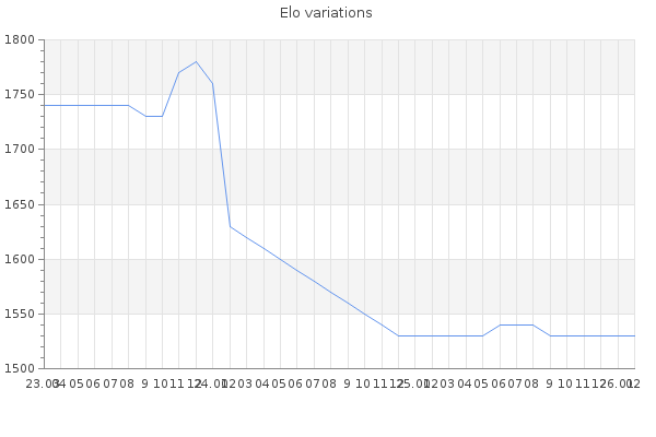 Elo no rounded:1527.8 Rd ( Small rd indicates a reliable elo ) : 80 Elo max :2290 Elo max this year :2290 Moves played :9938 Country:Venezuela