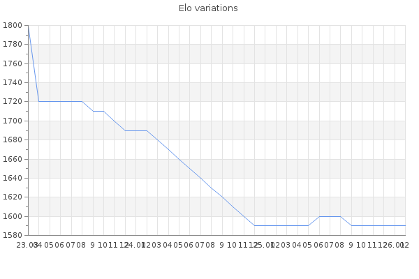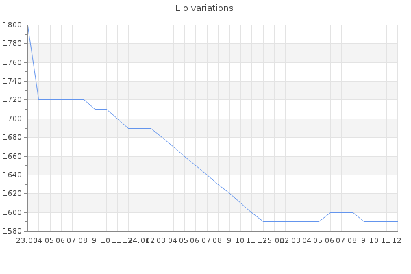 Elo no rounded:1585.7 Rd ( Small rd indicates a reliable elo ) : 141 Elo max :1720 Elo max this year :1720 Moves played :135 Country:Israel