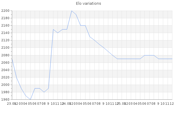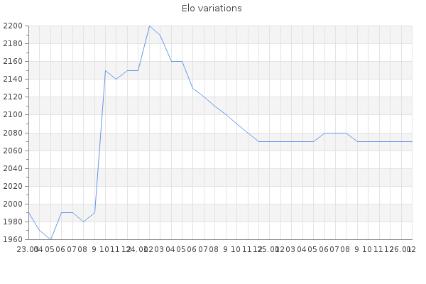 Elo no rounded:2074.1 Rd ( Small rd indicates a reliable elo ) : 90 Elo max :2200 Elo max this year :2200 Moves played :28474 Country:France