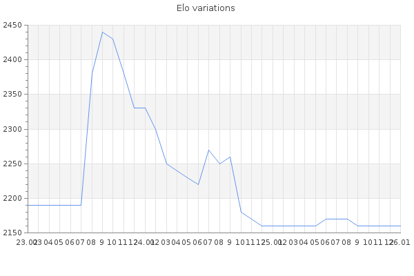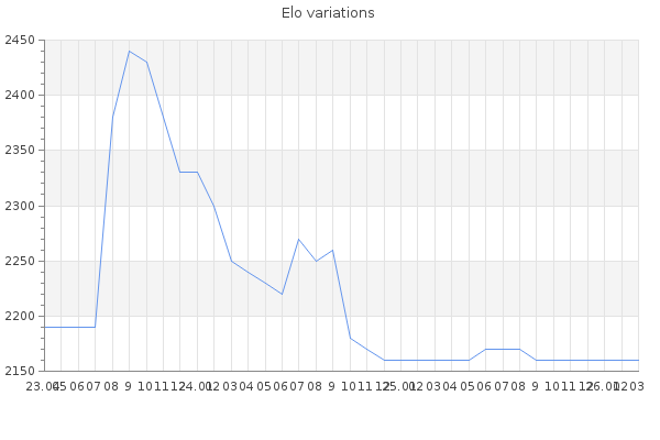 Elo no rounded:2163 Rd ( Small rd indicates a reliable elo ) : 92 Elo max :2630 Elo max this year :2630 Moves played :6241 Country:United Kingdom