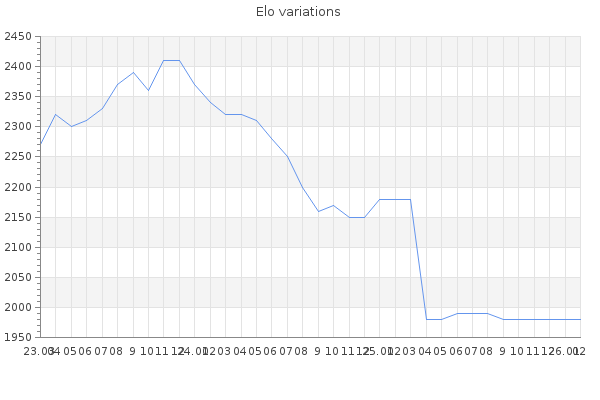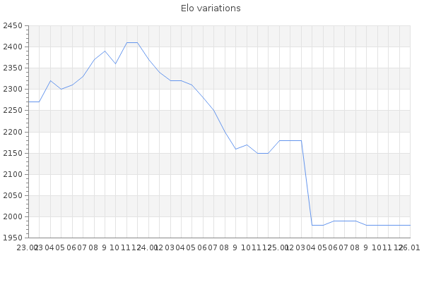 Elo no rounded:1984.9 Rd ( Small rd indicates a reliable elo ) : 80 Elo max :2420 Elo max this year :2420 Moves played :11422 Country:Canada