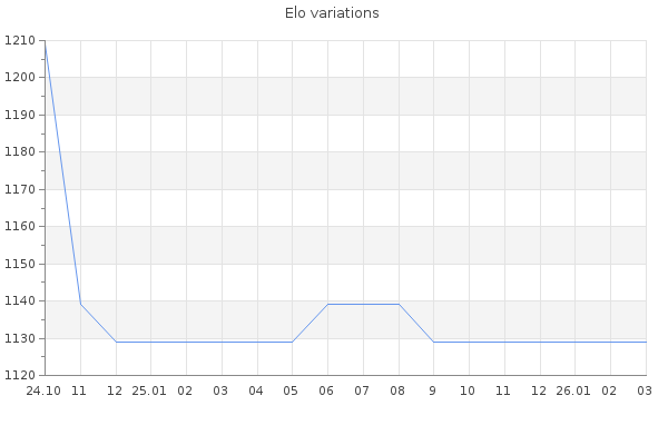 Elo no rounded:1133 Rd ( Small rd indicates a reliable elo ) : 179 Elo max :0 Elo max this year :0 Moves played :19 Country:Estonia