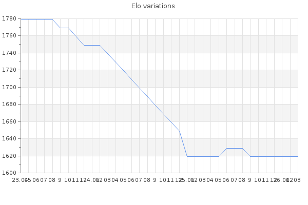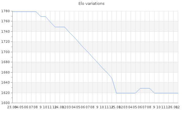 Elo no rounded:1623.8 Rd ( Small rd indicates a reliable elo ) : 374 Elo max :0 Elo max this year :0 Moves played :6 Country:Christmas Island