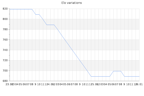 Elo no rounded:690.7 Rd ( Small rd indicates a reliable elo ) : 206 Elo max :0 Elo max this year :0 Moves played :54 Country:Italy