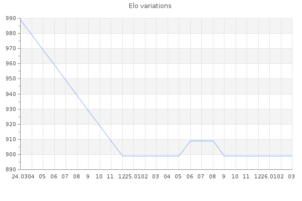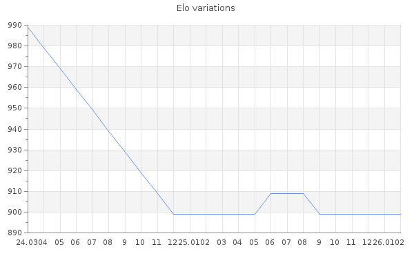 Elo no rounded:899 Rd ( Small rd indicates a reliable elo ) : 350 Elo max :0 Elo max this year :0 Moves played :0 Country:France