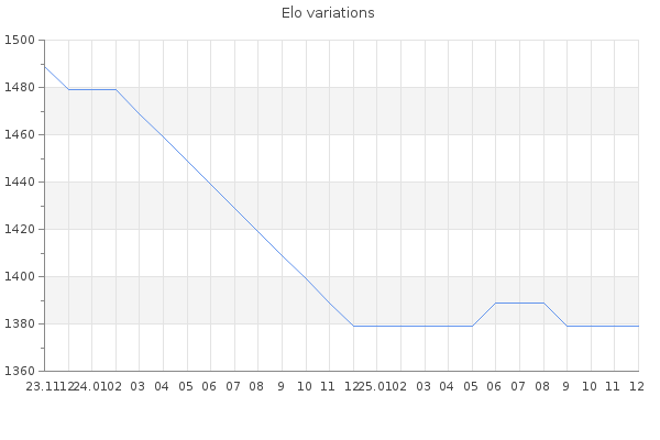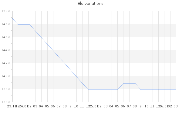 Elo no rounded:1379 Rd ( Small rd indicates a reliable elo ) : 350 Elo max :0 Elo max this year :0 Moves played :0 Country:Isle of Man