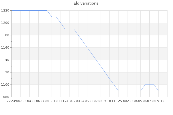Elo no rounded:1092.7 Rd ( Small rd indicates a reliable elo ) : 80 Fast Elo :1350 Fast Rd : 89 Elo max :1780 Elo max this year :1780 Moves played :22589 Country:Egypt