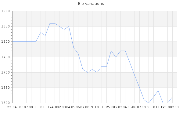 Elo no rounded:1623.3 Rd ( Small rd indicates a reliable elo ) : 117 Fast Elo :1520 Fast Rd : 100 Elo max :2240 Elo max this year :2240 Moves played :22836 Country:South Africa