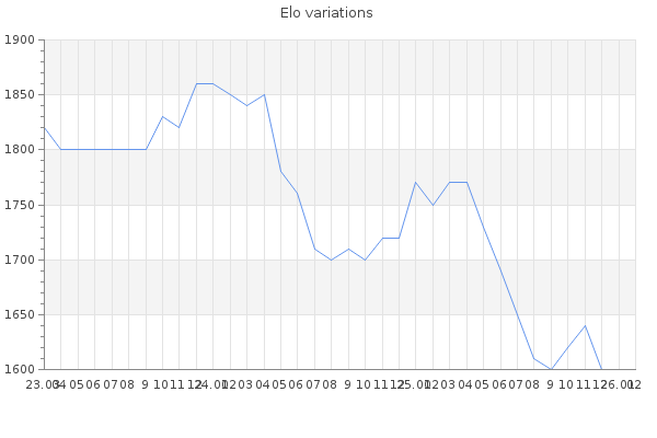 Elo no rounded:1602 Rd ( Small rd indicates a reliable elo ) : 111 Fast Elo :1520 Fast Rd : 100 Elo max :2240 Elo max this year :2240 Moves played :22829 Country:South Africa