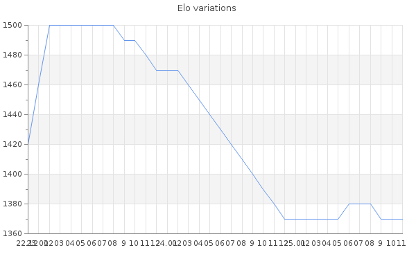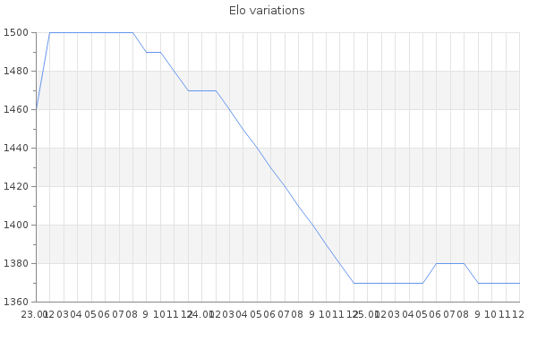Elo no rounded:1365.8 Rd ( Small rd indicates a reliable elo ) : 114 Elo max :1500 Elo max this year :1500 Moves played :407 Country:Canada