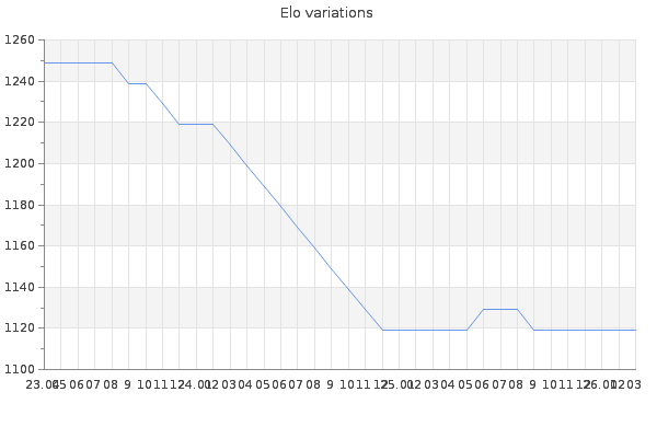 Elo no rounded:1121.5 Rd ( Small rd indicates a reliable elo ) : 202 Elo max :0 Elo max this year :0 Moves played :10 Country:Belgium