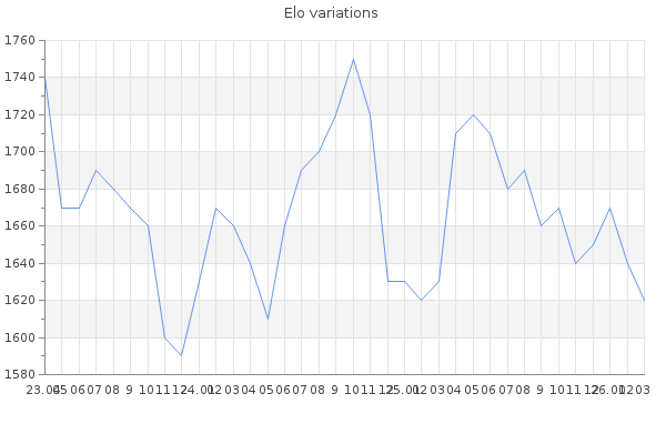Elo no rounded:1618.7 Rd ( Small rd indicates a reliable elo ) : 92 Elo max :2170 Elo max this year :2170 Moves played :85666 Country:Germany