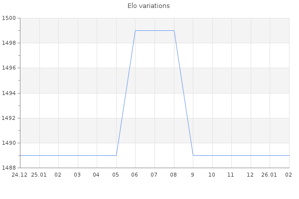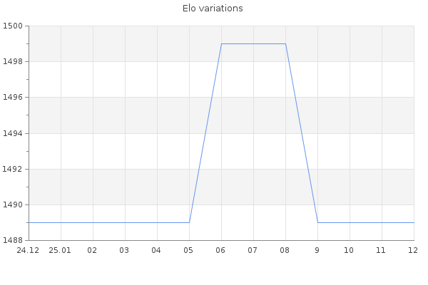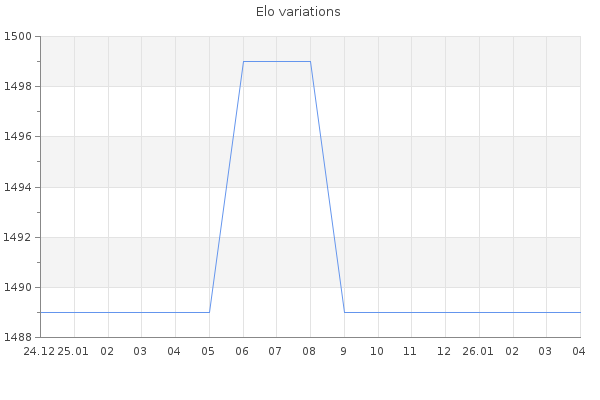 Elo no rounded:1489 Rd ( Small rd indicates a reliable elo ) : 350 Elo max :0 Elo max this year :0 Moves played :0 Country:United States of America