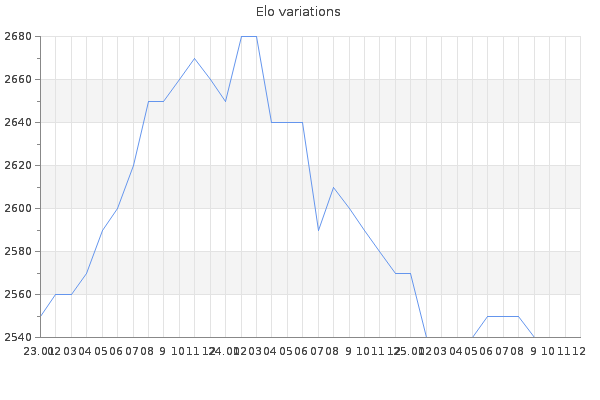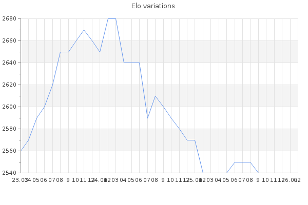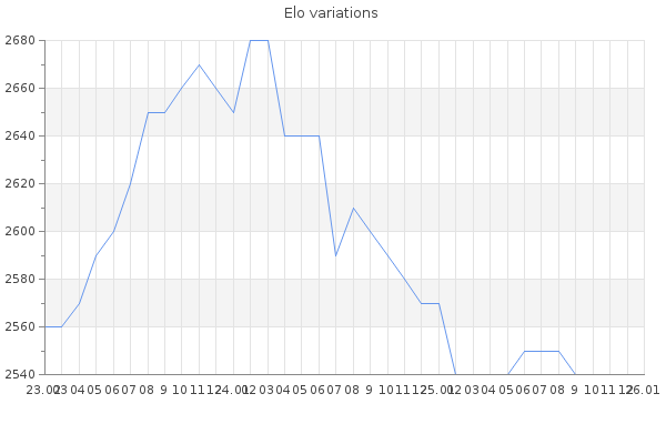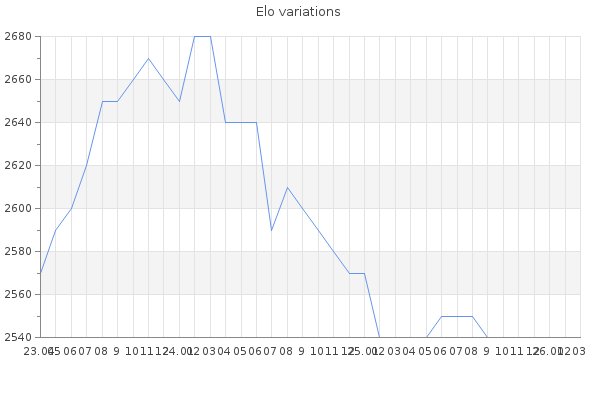 Elo no rounded:2540.7 Rd ( Small rd indicates a reliable elo ) : 91 Elo max :2680 Elo max this year :2680 Moves played :5527 Country:Czech Republic