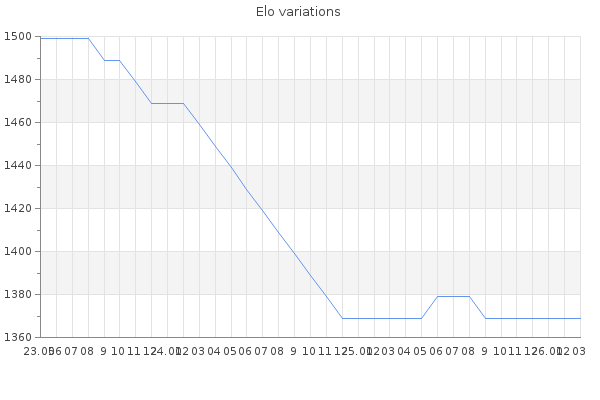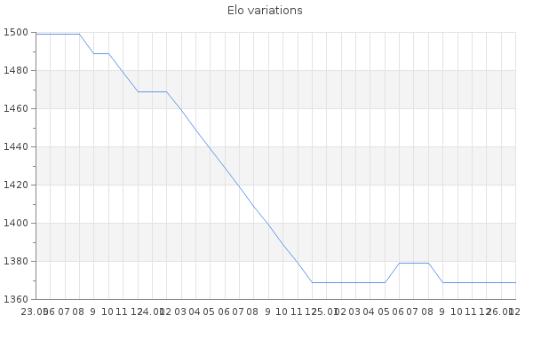 Elo no rounded:1369 Rd ( Small rd indicates a reliable elo ) : 350 Elo max :0 Elo max this year :0 Moves played :0 Country:United Kingdom