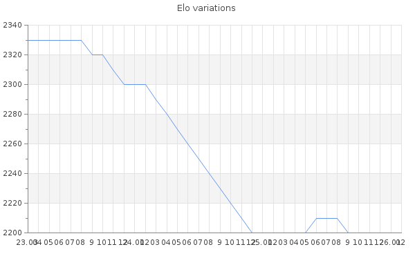 Elo no rounded:2196.6 Rd ( Small rd indicates a reliable elo ) : 100 Elo max :2800 Elo max this year :2800 Moves played :25204 Country:Czech Republic
