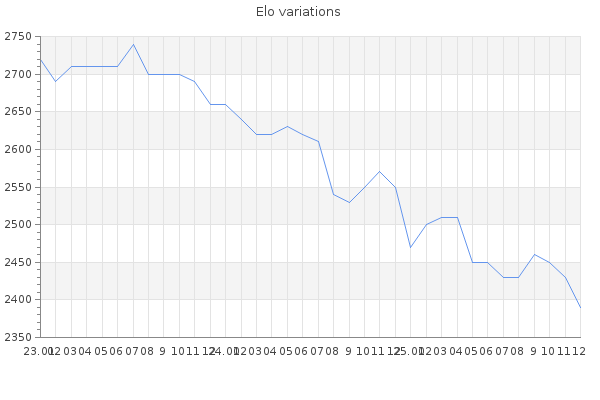 Elo no rounded:2394.6 Rd ( Small rd indicates a reliable elo ) : 83 Fast Elo :1779 Fast Rd : 252 Elo max :2940 Elo max this year :2940 Moves played :20259 Country:France
