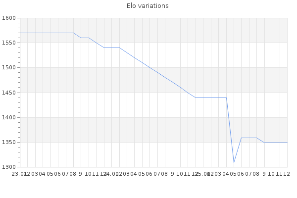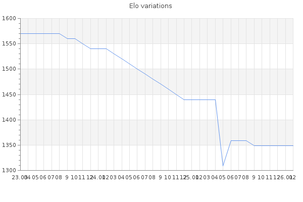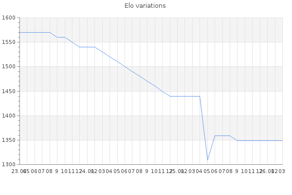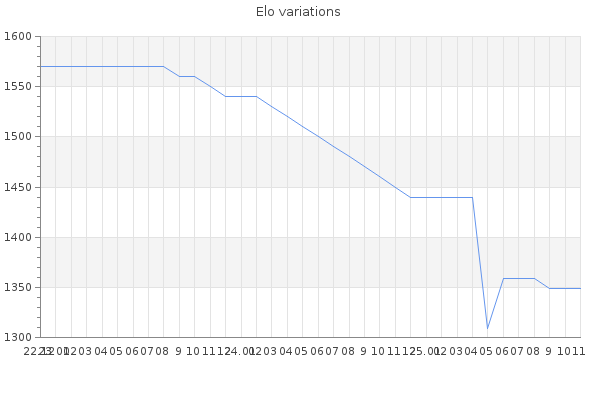 Elo no rounded:1351.8 Rd ( Small rd indicates a reliable elo ) : 169 Fast Elo :1479 Fast Rd : 218 Elo max :1920 Elo max this year :1920 Moves played :3596 Country:Spain