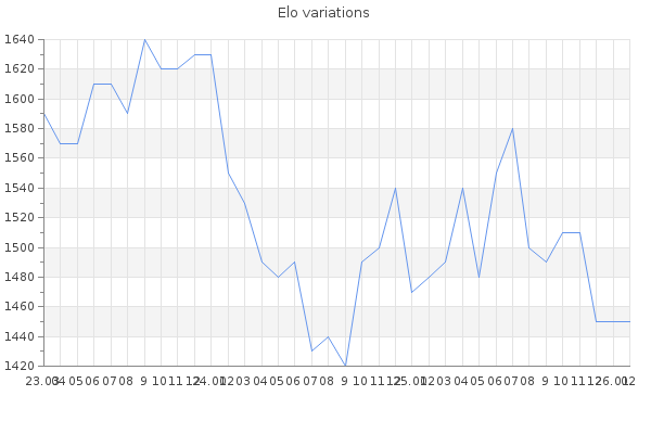 Elo no rounded:1448.8 Rd ( Small rd indicates a reliable elo ) : 90 Fast Elo :1259 Fast Rd : 177 Elo max :1970 Elo max this year :1970 Moves played :34090 Country:United States of America