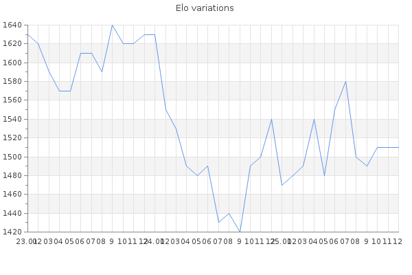 Elo no rounded:1508.2 Rd ( Small rd indicates a reliable elo ) : 90 Fast Elo :1259 Fast Rd : 177 Elo max :1970 Elo max this year :1970 Moves played :33971 Country:United States of America