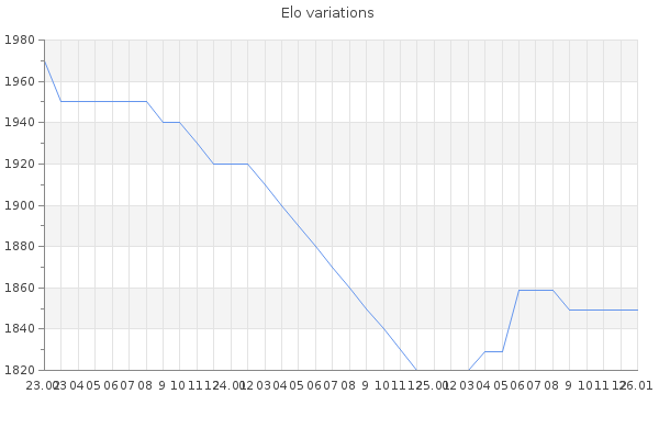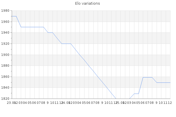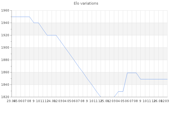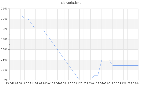 Elo no rounded:1845.9 Rd ( Small rd indicates a reliable elo ) : 151 Elo max :2100 Elo max this year :2100 Moves played :1708 Country:United Kingdom