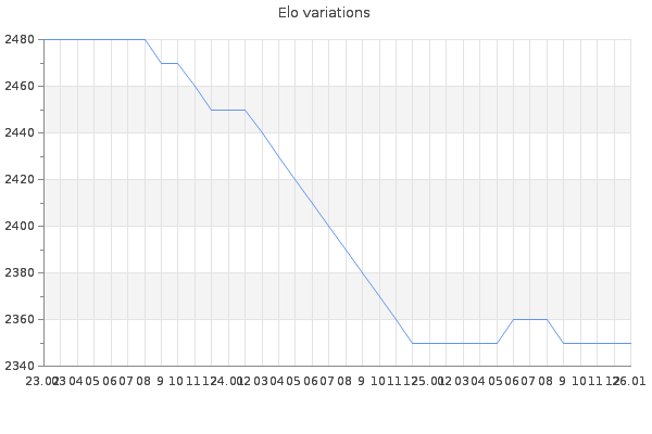 | yomismista | 2626 | 129 | 0 | -22 | | yomismista | 2563 | 133 | 0 | -27 | | mustaphly | 2851 | 110 | 0 | -14 | | nimzo | 2854 | 80 | 0 | -16 | | mustaphly | 2823 | 111 | 0 | -20 | |