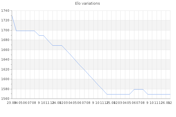 Elo no rounded:1570.5 Rd ( Small rd indicates a reliable elo ) : 162 Elo max :1770 Elo max this year :1770 Moves played :881 Country:United Kingdom