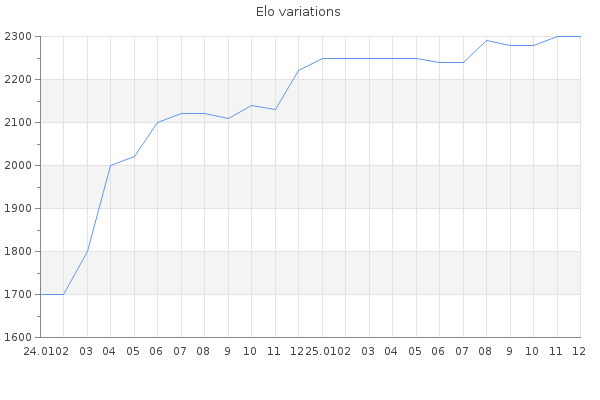 Elo no rounded:2300 Rd ( Small rd indicates a reliable elo ) : 127 Elo max :2300 Elo max this year :2300 Moves played :565 Country:United States of America