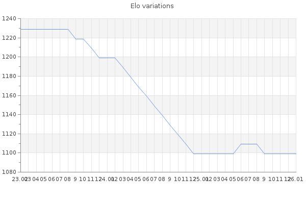 Elo no rounded:1094.4 Rd ( Small rd indicates a reliable elo ) : 179 Elo max :0 Elo max this year :0 Moves played :54 Country:Egypt