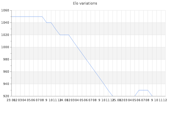 Elo no rounded:917.4 Rd ( Small rd indicates a reliable elo ) : 125 Fast Elo :1439 Fast Rd : 235 Elo max :1320 Elo max this year :1320 Moves played :265 Country:Andorra