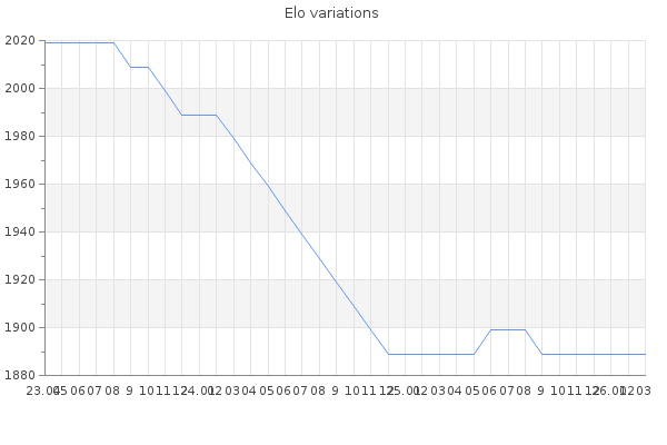 Elo no rounded:1893.9 Rd ( Small rd indicates a reliable elo ) : 151 Elo max :2100 Elo max this year :2100 Moves played :85 Country:France