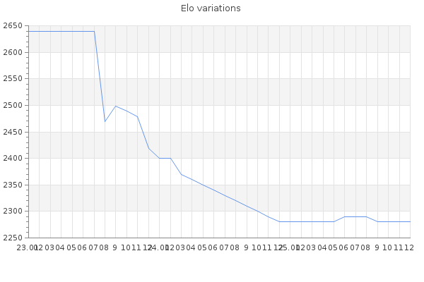 Elo no rounded:2277.8 Rd ( Small rd indicates a reliable elo ) : 139 Elo max :2450 Elo max this year :2450 Moves played :249 Country:Estonia