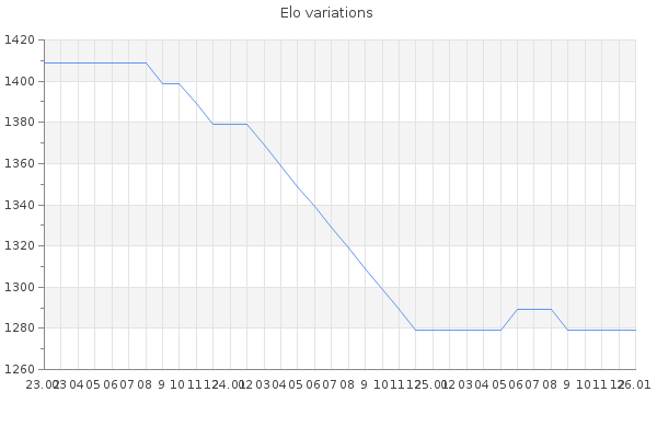 Elo no rounded:1276.3 Rd ( Small rd indicates a reliable elo ) : 198 Elo max :0 Elo max this year :0 Moves played :22 Country:United States of America