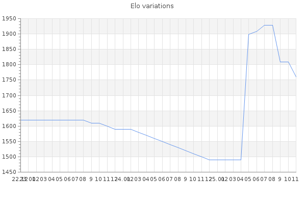 Elo no rounded:1760.9 Rd ( Small rd indicates a reliable elo ) : 145 Elo max :1890 Elo max this year :1890 Moves played :5918 Country:United Kingdom