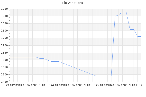 Elo no rounded:1760.9 Rd ( Small rd indicates a reliable elo ) : 145 Elo max :1890 Elo max this year :1890 Moves played :5955 Country:United Kingdom